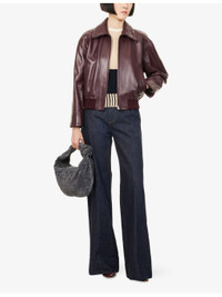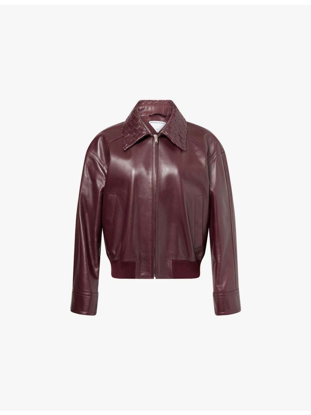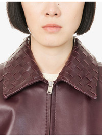 PRODUCT DETAILS - Bottega Veneta leather jacket - 100% lamb leather; contrast 81% cotton, 16% polyamide, 3% elastane; lining 68% cotton, 32% polyester; pocketlining 100% cotton - Concealed zip fastening at front - Spread collar - Buttoned cuffs - Regular fit, double-faced weave collar, long sleeves, two welt pockets at front, all-over smooth leather fully lined, ribbed trims - Specialist leather clean - Made in Italy - True to size - Model is 5ft 10in/1.78m and wears a size UK 8 - Midweight, non-stretch Ref: R04508469