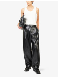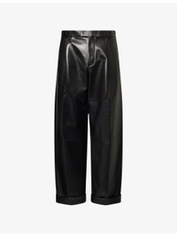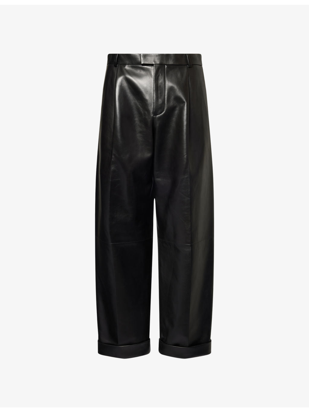 PRODUCT DETAILS - Bottega Veneta leather trousers - 100% leather - Concealed button, hook-and-eye and zip-fly fastenings at front - Regular fit, mid-rise, straight leg, belt loops, pleats at front, side slip pockets, welt pocket at back, fold-over hem - Specialist leather clean - Made in Italy - Size UK 32: rise 14in / 36cm, inside leg 31.5in / 80cm, leg opening 19in / 48cm - Model is 6ft 2in/1.88m and wears a size UK 32 - Midweight, non-stretch Ref: R04462275