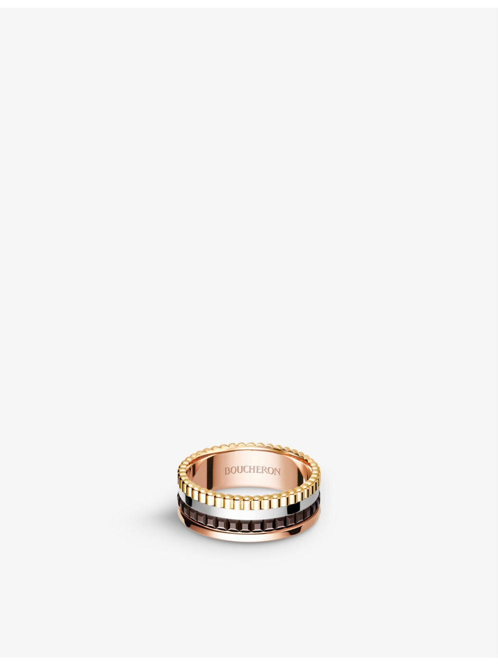 PRODUCT DETAILS - We recommend you to opt for 1 size larger than your usual size - Boucheron 18ct yellow-gold, white-gold and pink-gold ring - Multiple band ring - Brown PVD accent - Each Boucheron creation is available to order online using our Click & Collect service at Selfridges London. You will collect your order at the Boucheron boutique in The Wonder Room.