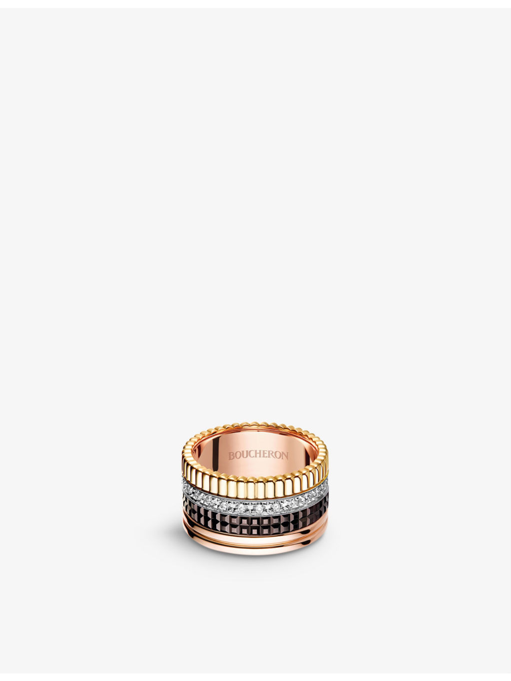 PRODUCT DETAILS - We recommend you to opt for 2 sizes larger than your usual size - Boucheron 18ct yellow-gold, white-gold, pink-gold and 0.49ct diamond ring - Multiple-band ring - 25 round diamonds totalling 0.49ct - Brown PVD accent - Each Boucheron creation is available to order online using our Click & Collect service at Selfridges London. You will collect your order at the Boucheron boutique in The Wonder Room.