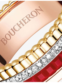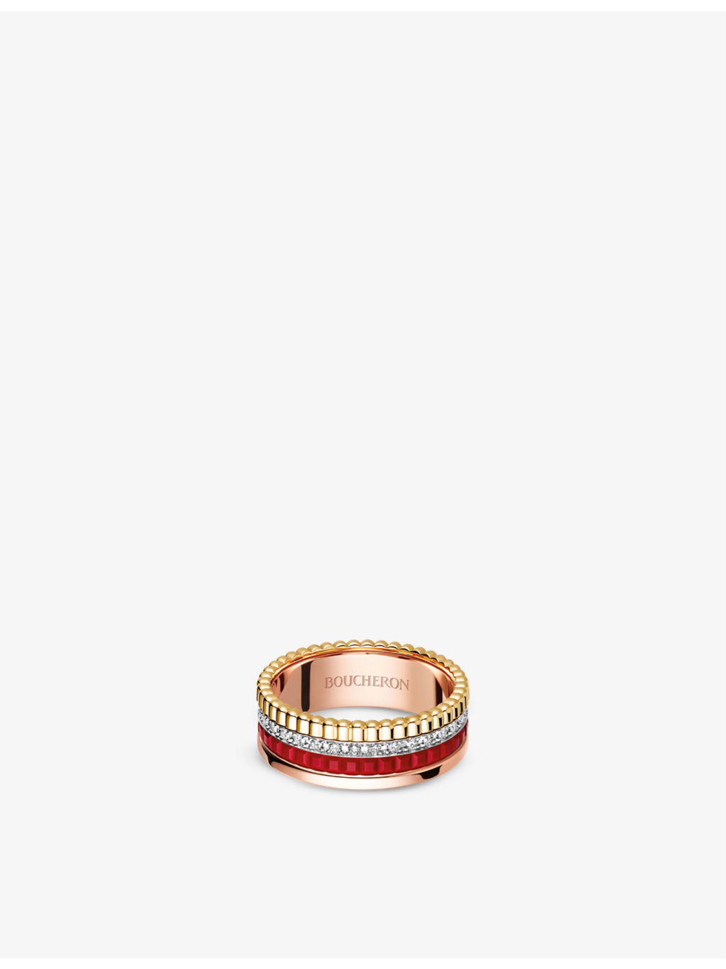 PRODUCT DETAILS - We recommend you to opt for 1 size larger than your usual size - Boucheron 18ct yellow-gold, rose-gold, white-gold, ceramic and diamond ring - 18ct yellow-gold, 18ct rose-gold, 18ct white-gold, red ceramic - 33 diamonds totalling 0.24ct Ref: 785-10169-JRG02938
