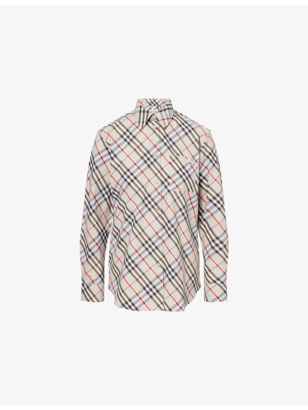 PRODUCT DETAILS - Burberry cotton shirt - 100% cotton; buttons 100% mother of pearl - Exposed button fastening at front - Spread collar - Buttoned cuffs - Relaxed fit, collar, long sleeves, patch pocket and brand embroidery at front, straight yoke at back, all-over check print, curved hem - Dry clean - Made in Tunisia - True to size - Size UK 8: length 27in / 70cm - Model is 5ft 10in/1.78m and wears a size UK 8 - Lightweight, non-stretch Ref: R04486197