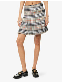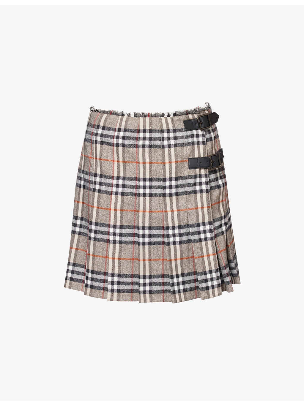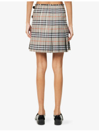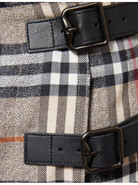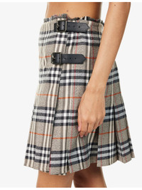 PRODUCT DETAILS - Burberry wool mini skirt - 100% wool; trims 100% calf leather - Buckle fastening at front - Regular fit, mid-rise, fringed waistband, wrap front, all-over check print, pleated, leather buckles - Dry clean - Made in Poland - True to size - Size UK 8: length 18in / 46cm - Model is 5ft 10in/1.78m and wears a size UK 8 - Lightweight, slight stretch Ref: R04486203