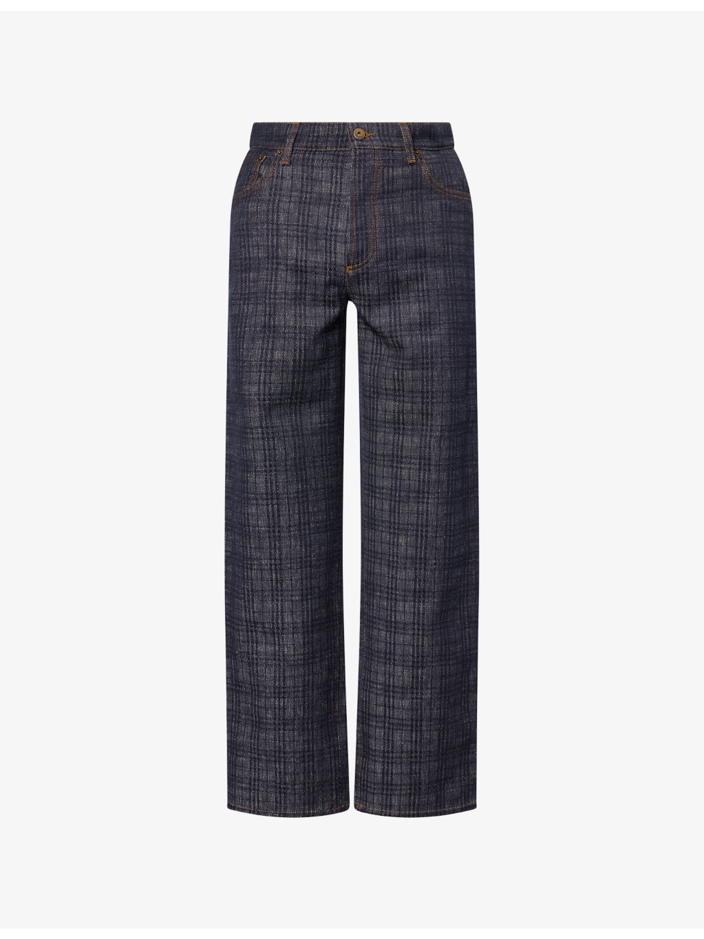 PRODUCT DETAILS - Burberry denim jeans - 100% cotton; trims 50% calf leather, 50% lamb leather - Exposed button and concealed button-fly fastening at front - Regular fit, mid-rise, straight leg, belt loops, five pockets, brand patch at back, all-over check-print - Machine wash at 30°C - Made in Italy - Size UK 30: rise 13in / 33cm, inside leg 31in / 80cm, leg opening 18in / 46cm - Model is 6ft 2in/1.88m and wears a size UK 30 - Midweight, stretchy Ref: R04485537