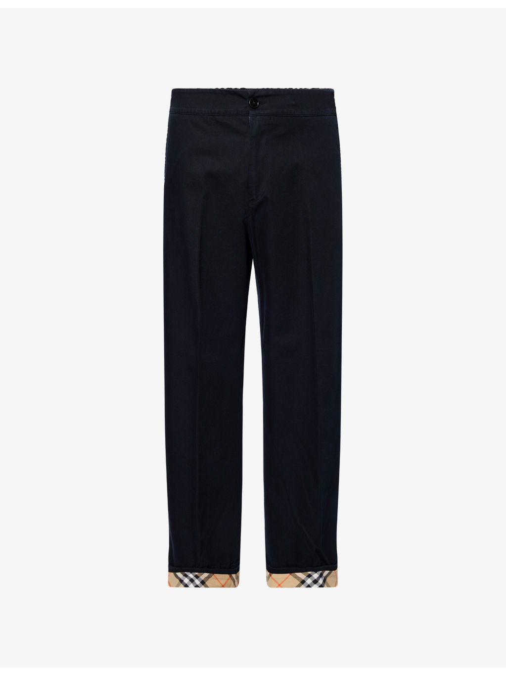 PRODUCT DETAILS - Burberry cotton trousers - 100% cotton - Button and zip-fly fastening at front - Elasticated waistband, two slip pockets at front, two patch pockets at back, embroidered detailing at back pocket, turn-up cuff, signature checked print at cuff turn-up - Hand wash - Made in Italy - Size UK 32: rise 12.9in / 33cm, inside leg 31.1in / 79cm, leg opening 18.1in / 48cm - Model is 6ft 2in/1.88m and wears a size UK 32 - Lightweight, non-stretch Ref: R04485540