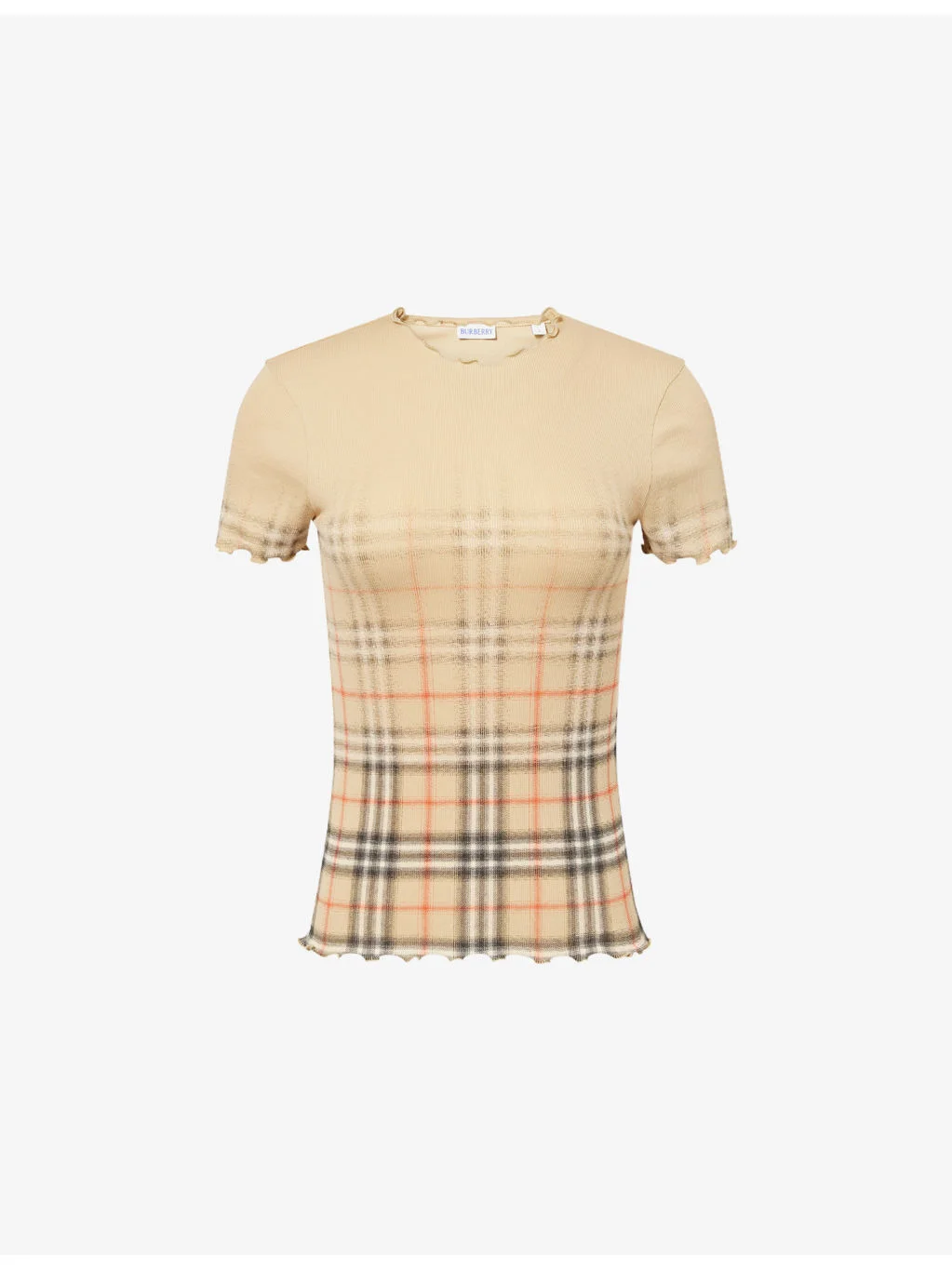 PRODUCT DETAILS - Burberry stretch-cotton top - 95% cotton, 5% elastane - Slim fit, round neck, short sleeves, ruffled edges, all-over subtle gradient check print, ribbed knit - Machine wash at 30°C - Made in Portugal - True to size - Model is 5ft 10in/1.78m and wears a size small - Lightweight, slight stretch Ref: R04562945
