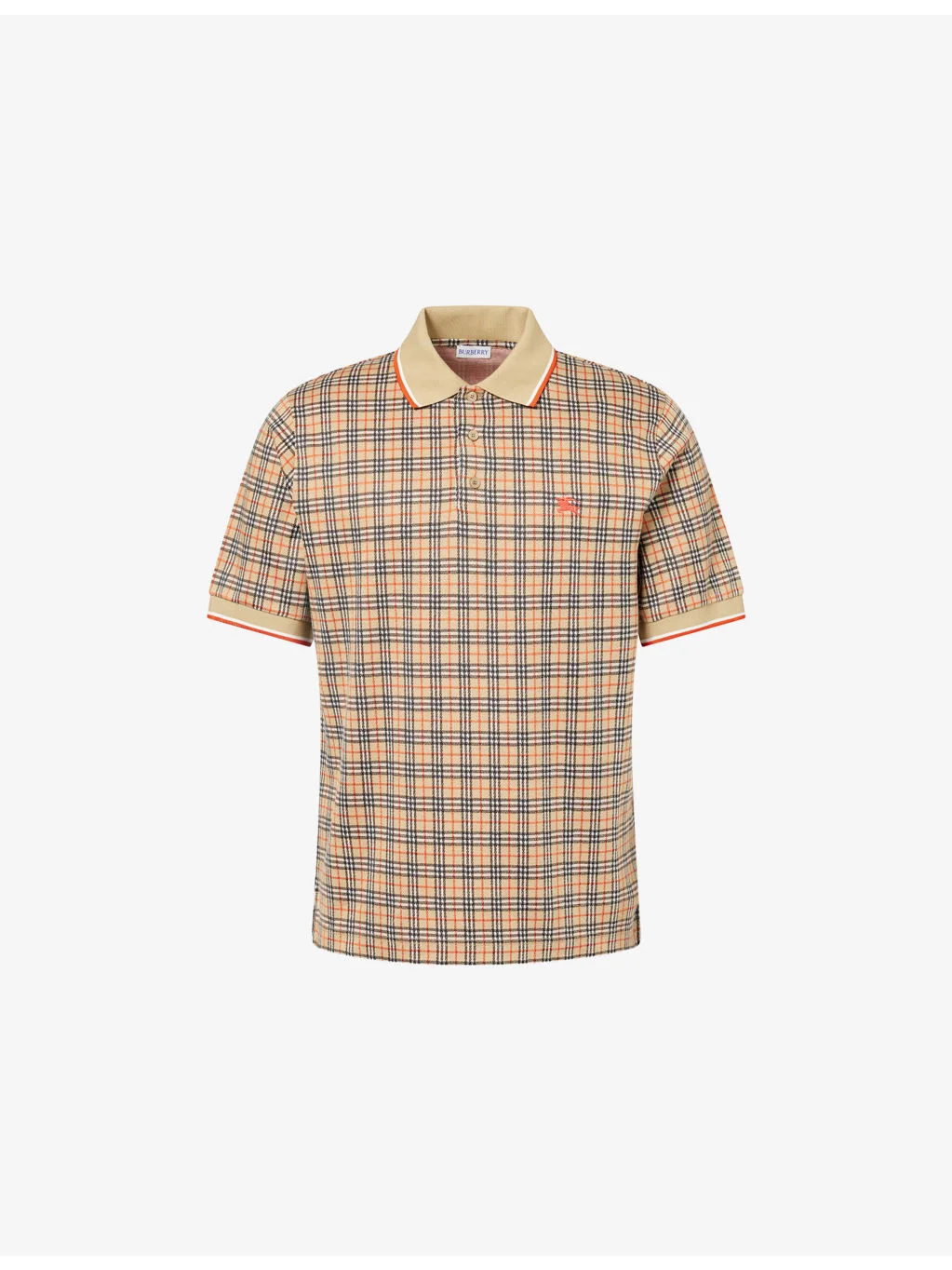 PRODUCT DETAILS - Burberry knit polo shirt - 53% viscose, 36% cotton, 10% polyamide, 1% elastane - Button fastening at front - Regular fit, polo collar, short sleeves, embroidered logo at chest, all-over signature check pattern, ribbed trims - Machine wash at 30°C - Made in Portugal - Model is 6ft 2in/1.88m and wears a size medium - Midweight, slight stretch Ref: R04552863