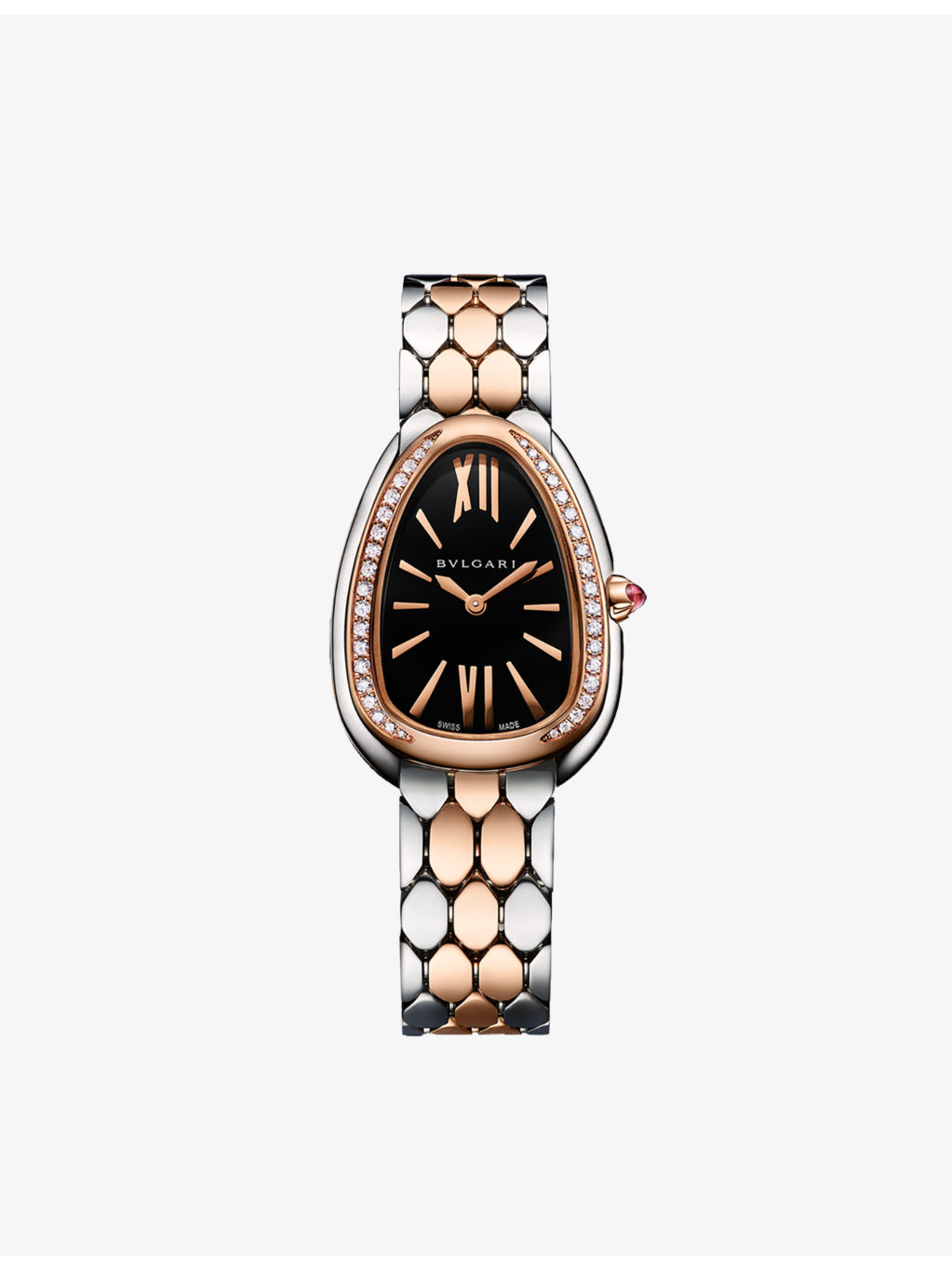PRODUCT DETAILS - Bvlgari 18ct rose-gold, stainless-steel and diamond quartz watch - Style number: 103450 - 100% 18ct rose gold, 100% stainless steelDiamonds - Folding-buckle fastening - Drop-shaped watch head, rose gold dial, crown set with a cabochon-cut pink rubelite insert, hours, minutes - Case diameter: 33mm - Please refer to the brand’s care instructions - Water resistance: 3 bar / 3 atm / 30m / 100ft - Made in Switzerland - Two-year manufacturer's warranty - Bvlgari prides itself on providing excellent customer service. This includes contacting customers to offer after-sales care and share details about its brand and products. As such, when you order a Bvlgari product from us, your details will be passed onto Bvlgari so that it can provide these services to you. - To learn more about this product or for expert styling services, get in touch with our Personal Shopping team Ref: R04208007
