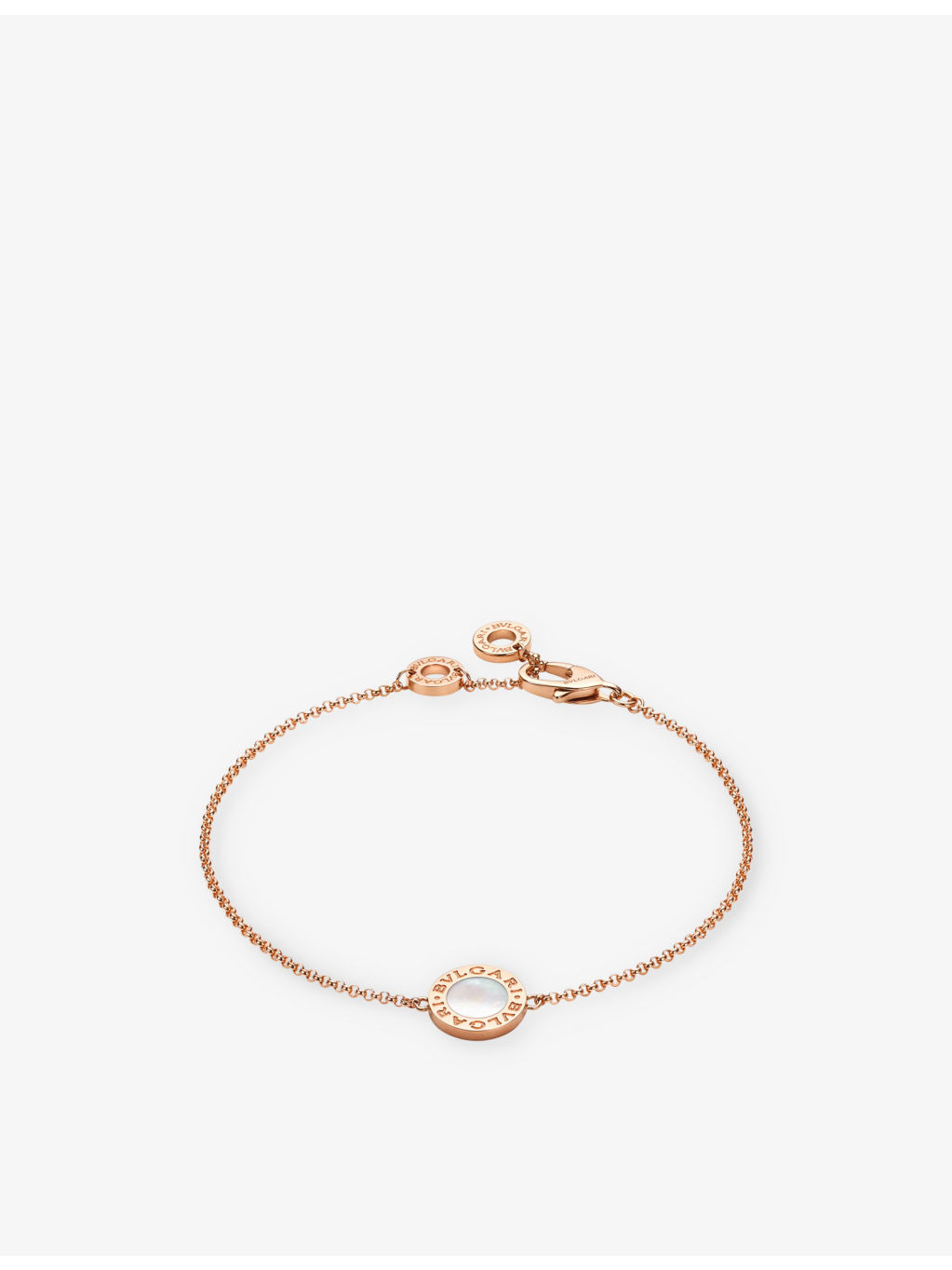 PRODUCT DETAILS - Bvlgari BVLGARI BVLGARI 18ct rose-gold and mother-of-pearl bracelet - 100% 18ct rose gold - Lobster-clasp fastening - Polished finish, circular mother-of-pearl embellished charm, fine chain - Chain type: cable chain - Please use a soft, dry polishing cloth - Made in Italy - Two-year manufacturer's warranty - Bvlgari prides itself on providing excellent customer service. This includes contacting customers to offer after-sales care and share details about its brand and products. As such, when you order a Bvlgari product from us, your details will be passed onto Bvlgari so that it can provide these services to you. Ref: R04319499