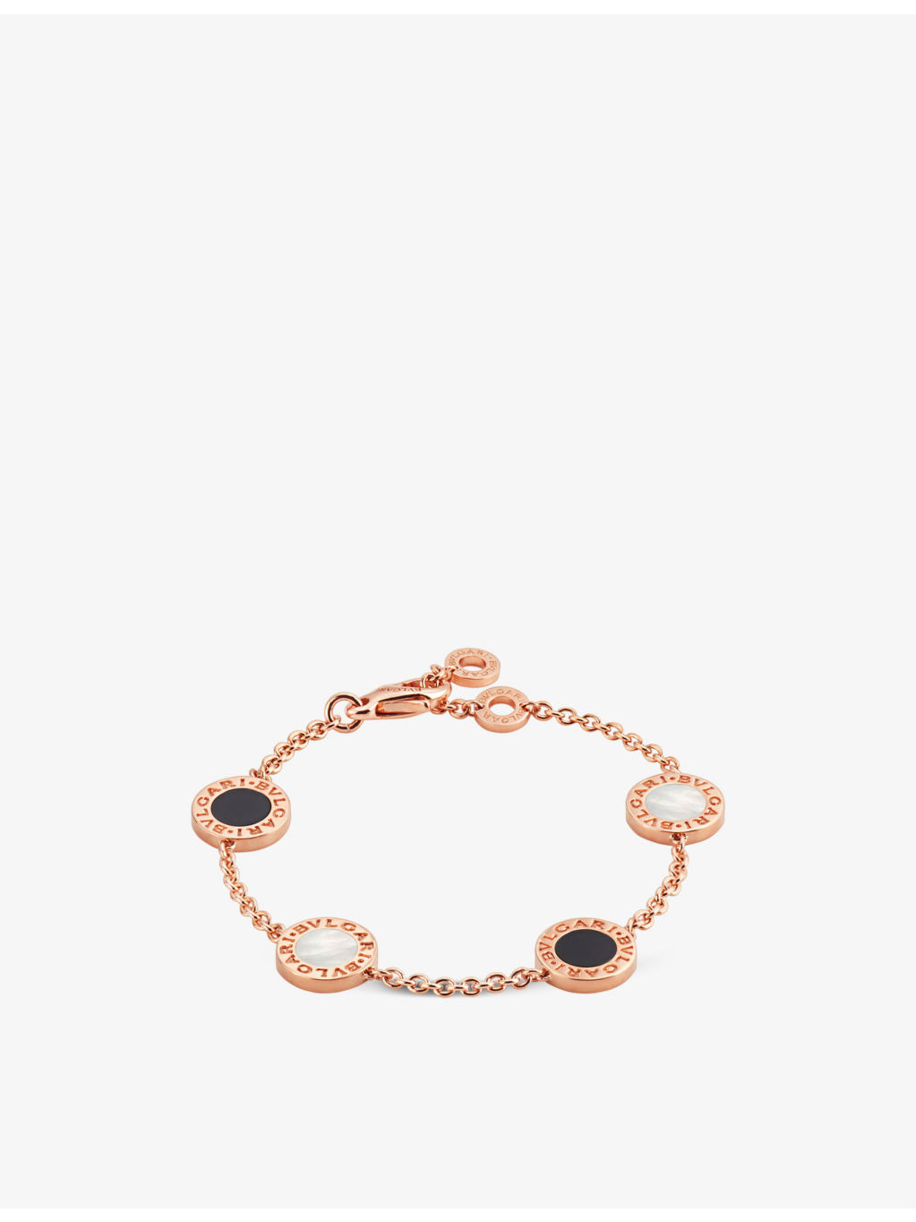PRODUCT DETAILS - Bvlgari 18ct rose-gold, mother of pearl and onyx bracelet - 100% rose gold - Mother of pearl, onyx - Lobster-clasp fastening - Round, rose gold tone, gemstone embellished, logo engraved, polished - Chain type: rope chain - Chain length: 15-19cm - Made in Italy - Please use a soft, dry polishing cloth - Bvlgari prides itself on providing excellent customer service. This includes contacting customers to offer after-sales care and share details about its brand and products. As such, when you order a Bulgari product from us, your details will be passed onto Bvlgari so that it can provide these services to you. Ref: R03984023