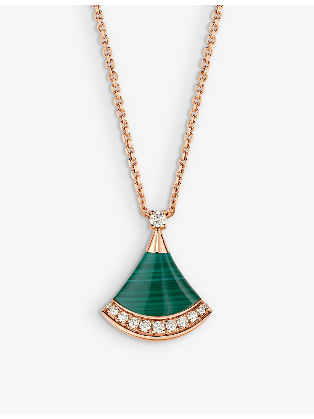 PRODUCT DETAILS - Bvlgari 18ct rose-gold, 0.13ct brilliant-cut diamond and malachite pendant necklace - 100% 18ct rose gold - 12 diamonds, 1 malachite - Lobster-clasp fastening - Polished finish, pave-set stones, fan motif with malachite insert - Carat weight: diamond 0.13ct - Carat cut: round brilliant - Carat clarity: IF-VS - Carat colour: D-G - Chain type: cable chain - Pendant height 1.5cm - Made in Italy - Please use a soft, dry polishing cloth - Five-year manufacturer's warranty - Bvlgari prides itself on providing excellent customer service. This includes contacting customers to offer after-sales care and share details about its brand and products. As such, when you order a Bvlgari product from us, your details will be passed onto Bvlgari so that it can provide these services to you. Ref: R04265233
