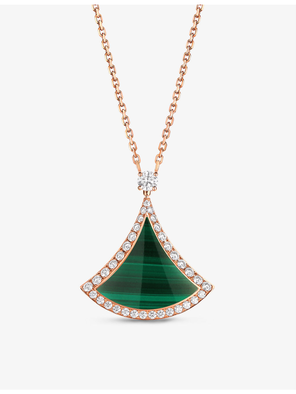 PRODUCT DETAILS - Bvlgari 18ct rose-gold, 0.5ct brilliant-cut diamond and malachite pendant necklace - 100% rose gold - Lobster-clasp fastening - Adjustable chain, fan-shape pendant, polished finish - Made in Italy - Carat weight: 0.5ct - Carat cut: round brilliant - Carat clarity: IF-VS - Carat colour: D-G - Chain type: cable chain - Chain length: 41cm-43cm - Please refer to the brand’s care instructions - Bvlgari prides itself on providing excellent customer service. This includes contacting customers to offer after-sales care and share details about its brand and products. As such, when you order a Bulgari product from us, your details will be passed onto Bvlgari so that it can provide these services to you. Ref: R03984057