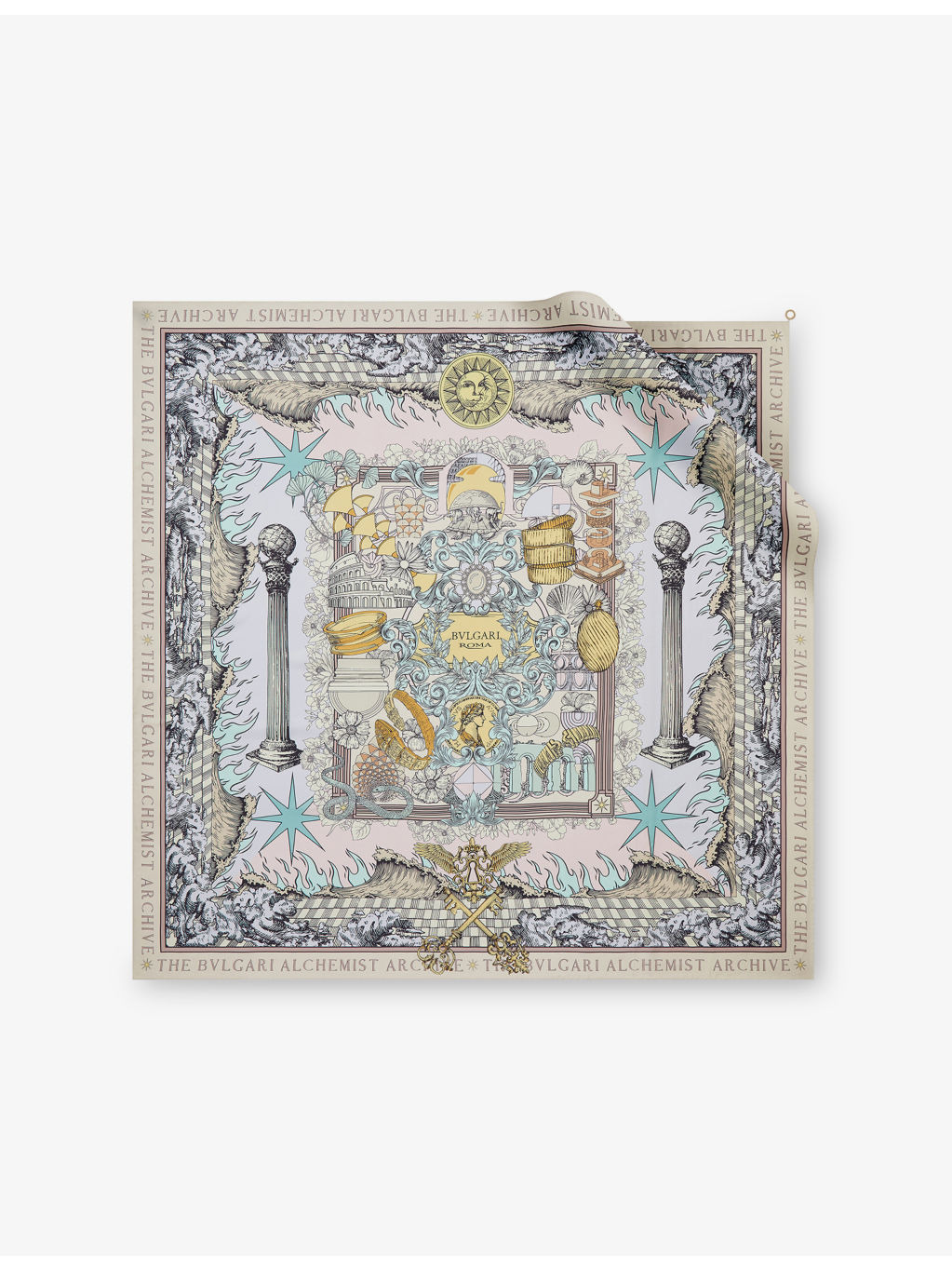 PRODUCT DETAILS - Bvlgari silk scarf - 100% silk - Self-tie fastening - Bvlgari Bvlgari metal pendant, graphic print celebrating motifs from Bvlgari Archives, branded border, handmade - Length 90cm, width 90cm - Dry clean only - Made in Italy - Bvlgari prides itself on providing excellent customer service. This includes contacting customers to offer after-sales care and share details about its brand and products. As such, when you order a Bvlgari product from us, your details will be passed onto Bvlgari so that it can provide these services to you. Ref: R04485762