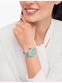 PRODUCT DETAILS - Bvlgari stainless-steel, 0.2200ct brilliant-cut diamond and mother-of-pearl automatic watch - 100% stainless steel; 12 diamonds - Carat weight: 0.2200ct - Carat cut: round brilliant - Style number: RE00007 - Folding-buckle fastening - Round dial, automatic movement, sapphire-crystal glass, diamond indexes, B77 calibre, hours, minutes and seconds functions, polished case, mother-of-pearl intarsia marquetry dial, stainless-steel crown set with a synthetic cabochon-cut rubellite and a diamond, polished and satin-brushed stainless-steel bracelet with folding buckle - Case diameter: 33mm - Wipe with a clean, dry cloth - Water resistance: 5 bar / 5 atm / 50m / 165ft - Made in Switzerland - Five-year manufacturer's warranty