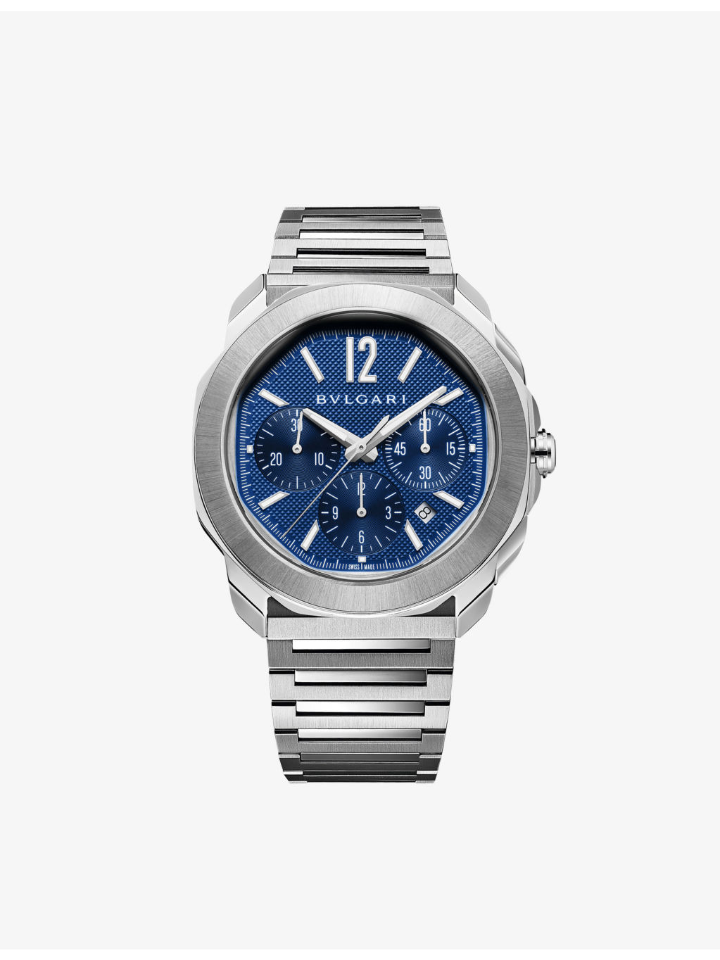 PRODUCT DETAILS - Bvlgari stainless-steel automatic watch - 100% stainless steel - Style number: RE00081 - Folding-buckle fastening - Octogonal Clous de Paris dial, satin-brushed and polished case, mechanical movement, automatic winding, synthetic-sapphire glass, BVL 399 calibre, interchangeable bracelet, 42hr power reserve, metallic indexes and hands filled with Super-LumiNova®, date opening at 4:30, small seconds at 3 o'clock, chronograph hour at 6 o'clock and chronograph minutes at 9 o'clock, stainless-steel screw crown with protective system - Case diameter: 42mm - Wipe with a clean, dry cloth - Water resistance: 10 bar / 10 atm / 100m / 330ft - Made in Switzerland - Five-year manufacturer's warranty - Bvlgari prides itself on providing excellent customer service. This includes contacting customers to offer after-sales care and share details about its brand and products. As such, when you order a Bvlgari product from us, your details will be passed onto Bvlgari so that it can provide these services to you Ref: R04319492