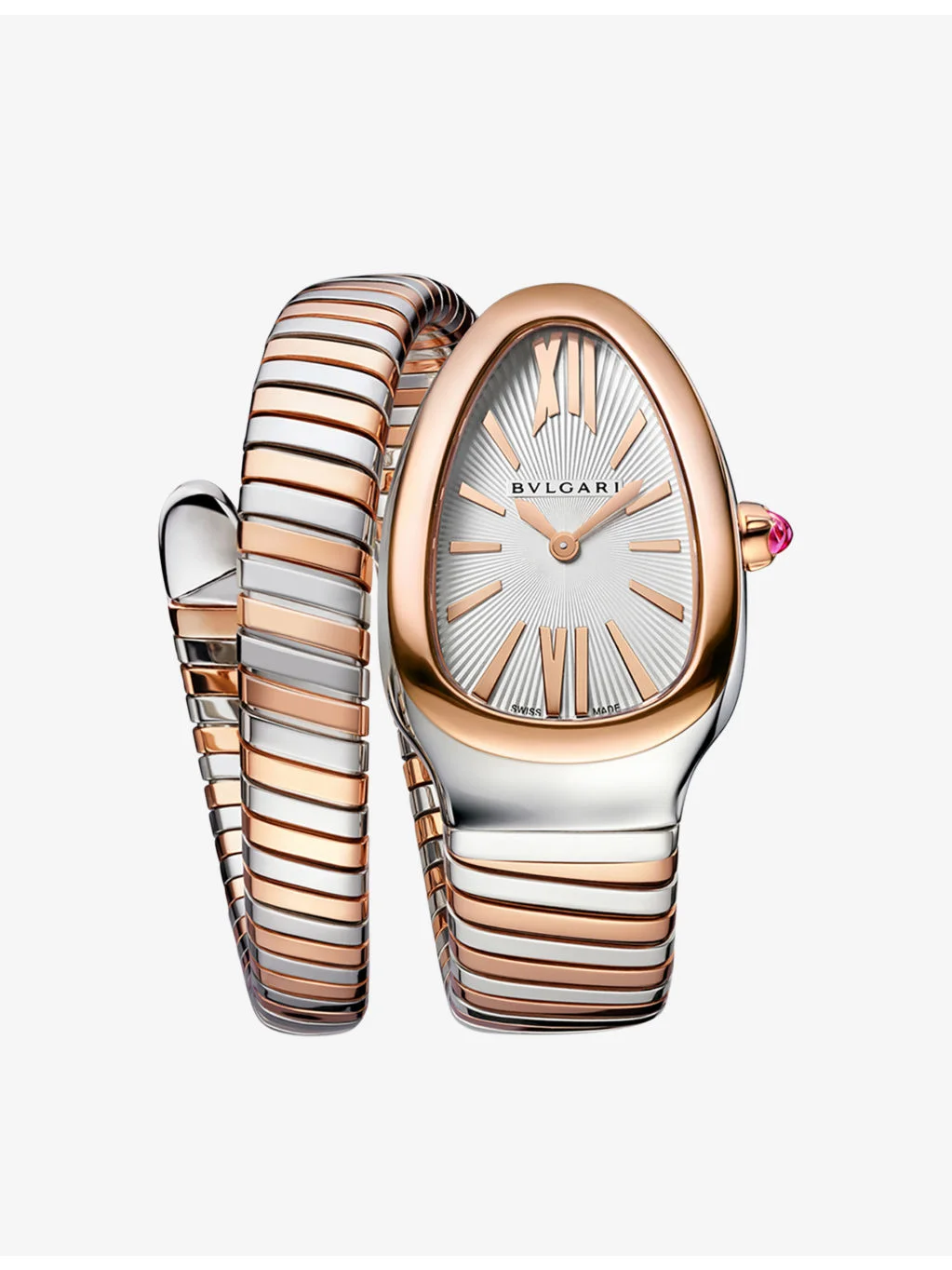 PRODUCT DETAILS - Bvlgari 18ct rose-gold and stainless-steel quartz watch - 100% 18ct rose gold; 100% stainless steel - Style number: SP35WSPG.1T - Slips on - Quartz movement, and single-spiral bracelet, crown set with a cabochon-cut pink rubellite, white opaline dial with guilloche soleil treatment, drop dial, Hour-Minute hands, E01.001 calibre - Case diameter: 35mm - Wipe with a clean, dry cloth - Water resistance: 3 bar / 3 atm / 30m / 100ft - Made in Switzerland - Two-year manufacturer's warranty - Bvlgari prides itself on providing excellent customer service. This includes contacting customers to offer after-sales care and share details about its brand and products. As such, when you order a Bvlgari product from us, your details will be passed onto Bvlgari so that it can provide these services to you. - To learn more about this product or for expert styling services, get in touch with our Personal Shopping team Ref: R03993262