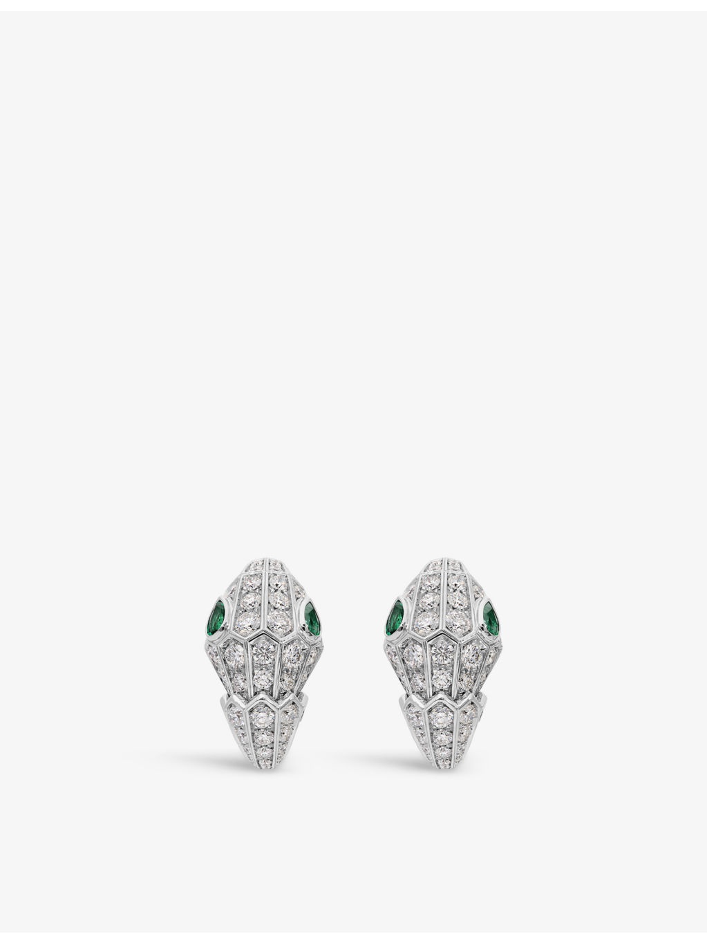PRODUCT DETAILS - Bvlgari 18ct white-gold, 3.11ct brilliant-cut diamond and 0.51ct emerald earrings - 100% 18ct white gold - Diamonds, 4 emeralds - Latch-back fastening - Polished finish, serpent design, pave-set diamonds - Carat weight: 3.11ct diamond, 0.51ct emerald - Carat cut: round brilliant - Carat clarity: IF-VS - Carat colour: D-G - Made in Italy - Please use a soft, dry polishing cloth - Two-year manufacturer's warranty - We regret that for hygiene reasons, earrings cannot be exchanged or refunded, unless faulty. - Bvlgari prides itself on providing excellent customer service. This includes contacting customers to offer after-sales care and share details about its brand and products. As such, when you order a Bvlgari product from us, your details will be passed onto Bvlgari so that it can provide these services to you. Ref: R04212473