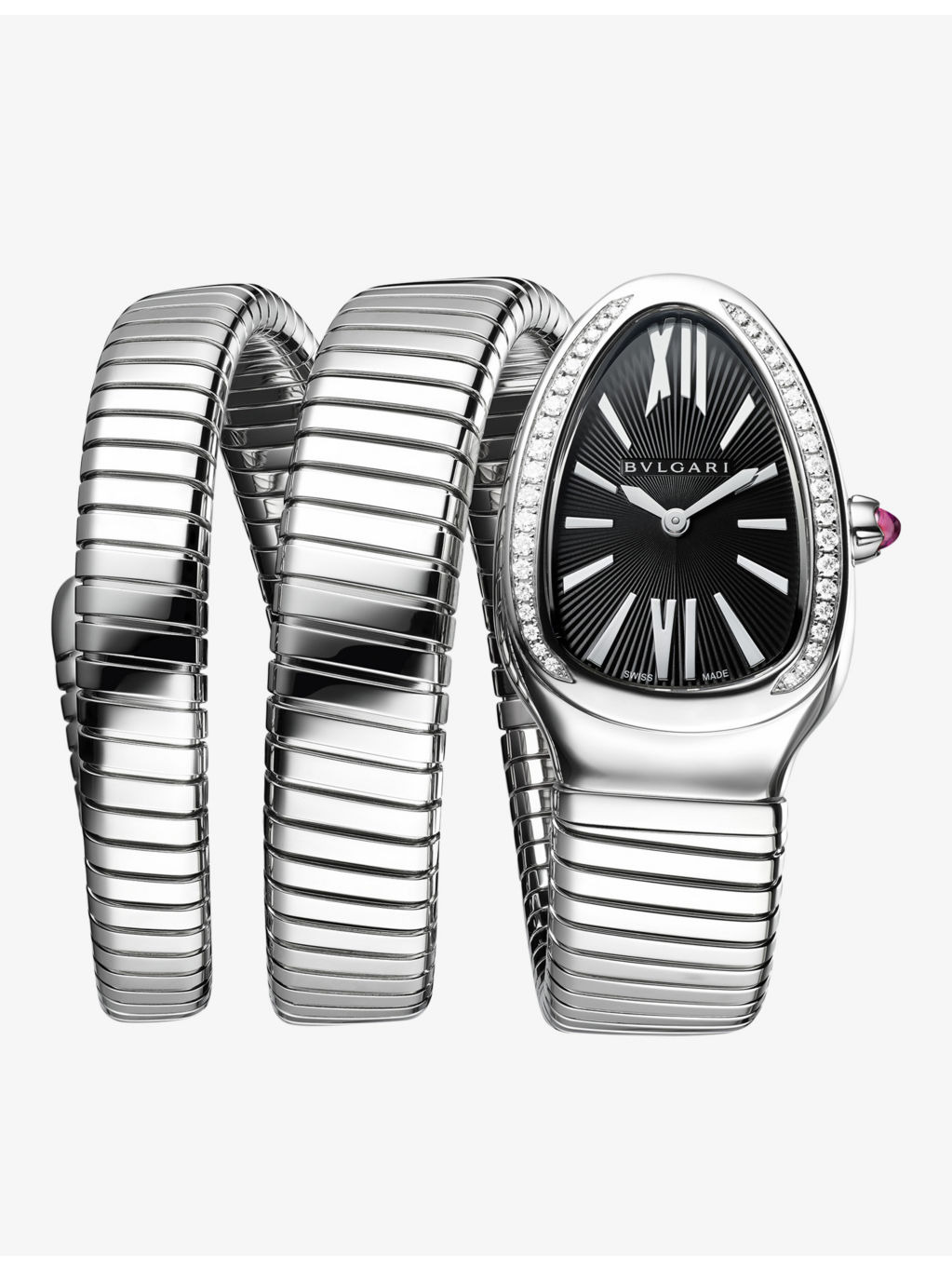 PRODUCT DETAILS - Bvlgari SP35BSDS2T Serpenti Tubogas stainless-steel and 0.29ct diamond quartz watch - 100% sterling silver - 38 diamonds - Style number: SP35BSDS2T - Slips on - Crown set with a cabochon-cut pink rubellite, black dial with guilloche soleil treatment, double-spiral bracelet, calibre B033 - Carat: 0.29ct - Cut: round brilliant - Dial: drop - Glass: synthetic sapphire - Case diameter: 35mm - Water resistance: more than 3 bar / 3 atm / 30m - Made in Switzerland - Please refer to the brand’s care instructions - 5-year warranty - Bvlgari prides itself on providing excellent customer service. This includes contacting customers to offer after-sales care and share details about its brand and products. As such, when you order a Bvlgari product from us, your details will be passed onto Bvlgari so that it can provide these services to you Ref: R04319479