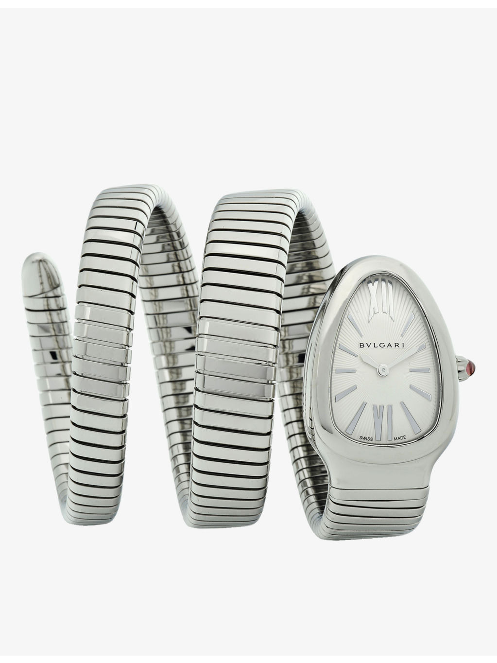 PRODUCT DETAILS - Bvlgari stainless-steel quartz watch - 100% stainless steel; bracelet 100% stainless steel - Style number: SP35C6SS.2T - Slips on - Synthetic-sapphire glass, opaline drop dial with guilloche soleil treatment, B033 calibre, 5 jewels, double-spiral bracelet and hand-applied indexes, curved case, crown set with a cabochon-cut rubellite - Case diameter: 35mm - Wipe with a clean, dry cloth - Water resistance: 3 bar / 3 atm / 30m / 100ft - Made in Switzerland - Two-year manufacturer's warranty - Bvlgari prides itself on providing excellent customer service. This includes contacting customers to offer after-sales care and share details about its brand and products. As such, when you order a Bvlgari product from us, your details will be passed onto Bvlgari so that it can provide these services to you. Ref: R04208013