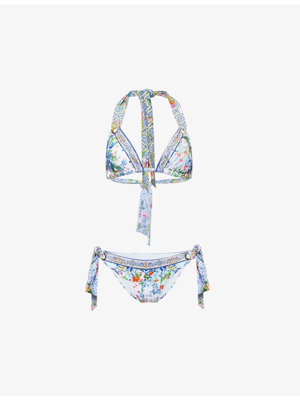 PRODUCT DETAILS - Camilla bikini set - 82% polyamide, 18% elastane - Self-tie fastening - Top: Triangle shape, halter self-tie, floral pattern - Bottom: Mid-rise, self-tie at sides, floral pattern, cheeky rear coverage - Machine wash cold - True to size - Model is 5ft 10in/1.78m and wears a size small - Lightweight, stretchy - For hygiene reasons, we are unable to exchange or refund this product if the protective adhesive strip has been removed. Ref: R04464311