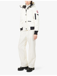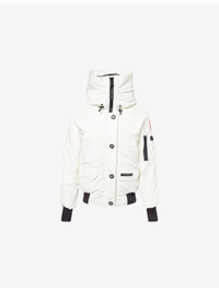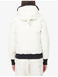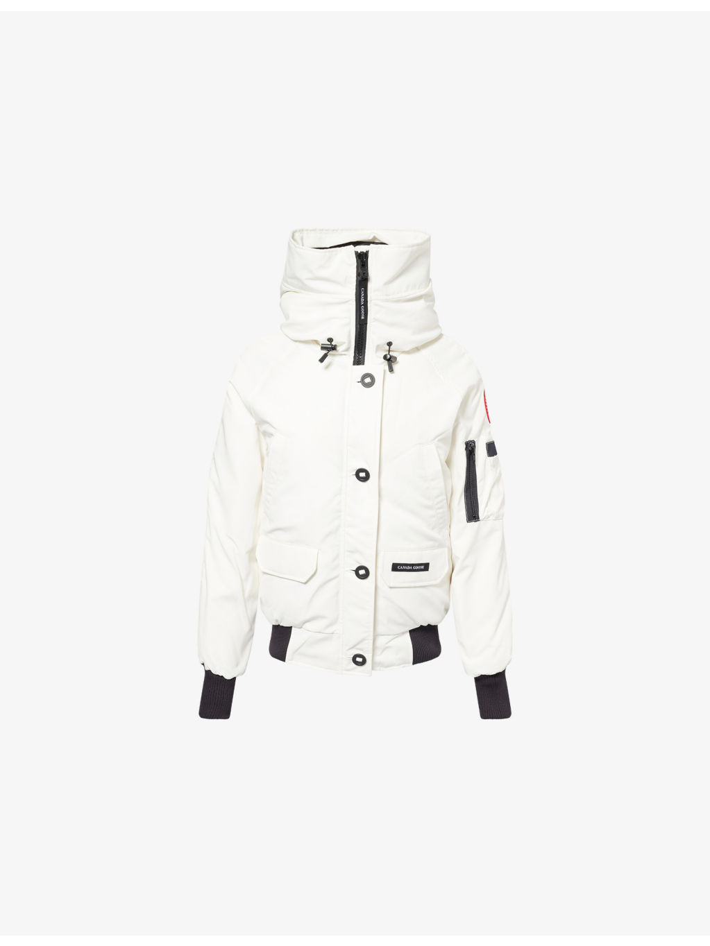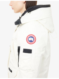 PRODUCT DETAILS - Canada Goose woven-down jacket - 84% polyester, 16% cotton; filling 80% duck down, 20% duck feather; lining 100% polyamide - Exposed button fastening and concealed zip fastening at front - Relaxed fit, high-neck, drawstring hood, raglan long sleeves, brand patch and zip pocket at sleeve, welt pocket and two buttoned pockets at front, brand patch at front, all-over padded, fully lined, contrast ribbed trims - Dry clean - True to size - Size small: length 24in / 61cm - Model is 5ft 10in/1.78m and wears a size small - Heavyweight, non-stretch Ref: R04515482