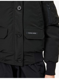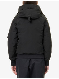 PRODUCT DETAILS - Canada Goose woven-down jacket - 84% polyester, 16% cotton; filling 80% duck down, 20% duck feather; lining 100% polyamide - Exposed button fastening and concealed zip fastening at front - Relaxed fit, high-neck, drawstring hood, raglan long sleeves, brand patch and zip pocket at sleeve, welt pocket and two buttoned pockets at front, brand patch at front, all-over padded, fully lined, ribbed trims - Dry clean - True to size - Size small: length 24in / 61cm - Model is 5ft 10in/1.78m and wears a size small - Heavyweight, non-stretch Ref: R04515480