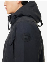PRODUCT DETAILS - Canada Goose cotton blend parka jacket - 68% cotton, 32% polyamide; filling 80% duck down, 20% duck feather; lining 100% polyamide - Zip fastening - Detachable hood, long sleeves, elasticated cuffs, brand logo badge at sleeve, four patch pockets at front, two, two slip pockets, zipped hem opening, padded, fully lined - Made in Canada - Size medium: length 30.3in / 77cm, chest 48in / 122cm - Model is 6ft 2in/1.88m and wears a size medium - Midweight, non-stretch Ref: R04534999