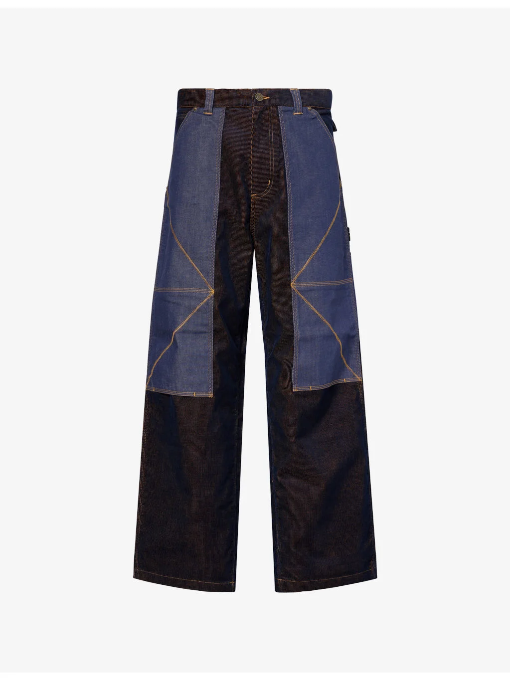 PRODUCT DETAILS - Carhartt WIP denim trousers - 56% polyester, 44% cotton - Button and zip-fly fastening - Relaxed fit, mid-rise, wide leg, structured waistband with belt loops, five pockets, contrast panels with contrast stitching, corduroy texture, branded hardware - Machine wash cold - Model is 6ft 2in/1.88m and wears a size medium - Midweight, non-stretch Ref: R04525618