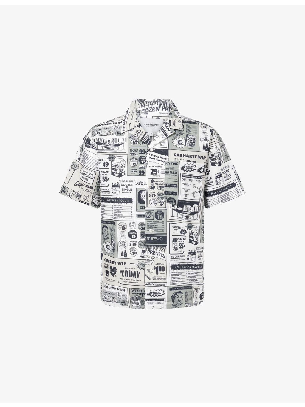 PRODUCT DETAILS - Carhartt WIP cotton shirt - 100% cotton - Exposed button fastening at front - Notched-collar, V-neck, short sleeves, one patch-pocket at front, all-over graphic print at front and back, topstitch detailing - Machine wash at 30°C - Size medium: length 30.3in / 77cm, chest 47.2in / 120cm - Model is 6ft 2in/1.88m and wears a size medium - Lightweight, non-stretch Ref: R04421685