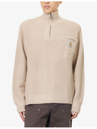 PRODUCT DETAILS - Carhartt WIP knitted jumper - 75% acrylic, 15% wool, 10% nylon - Concealed zip fastening at front - Relaxed fit, high-neck, long sleeves, zip pocket and brand patch at front, all-over knitted and ribbed - Hand wash cold - Model is 6ft 2in/1.88m and wears a size medium - Midweight, stretchy Ref: R04481703