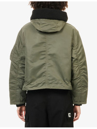 PRODUCT DETAILS - Carhartt WIP shell jacket - 100% nylon; filling 100% polyester; lining 100% polyester; trims 61% acrylic, 27% wool, 10% nylon, 2% elastane - Concealed zip fastening - Relaxed boxy fit, drawstring hood, detachable fleece trim at hood, long sleeves, popper tabs at cuffs, elasticated hidden cuffs, buttoned placket, two welt pockets at chest, two flap pockets at front, branded tab at front pocket, patch pocket at interior, zipped pocket at sleeve, all-over padding, all-over quilted lining, adjustable drawstring hem - Machine wash cold - True to size - Size small: length 23in / 58.5cm - Model is 5ft 10in/1.78m and wears a size small - Heavyweight, non-stretch Ref: R04574776
