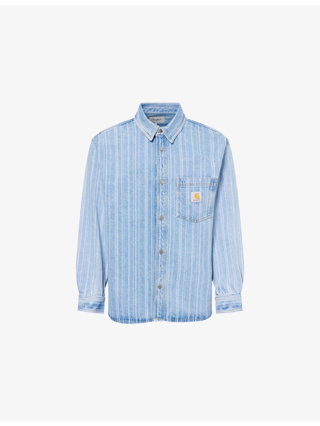 PRODUCT DETAILS - Carhartt WIP denim shirt - 100% cotton - Exposed button fastening at front - Pointed classic collar, long sleeves, buttoned cuffs, one patch pocket at chest, embroidered logo patch at chest, all-over striped pattern - Machine wash at 40°C - Made in Turkey - Size medium: length 33in / 84cm, chest 49.2in / 125cm - Model is 6ft 2in/1.88m and wears a size medium - Midweight, non-stretch Ref: R04467074