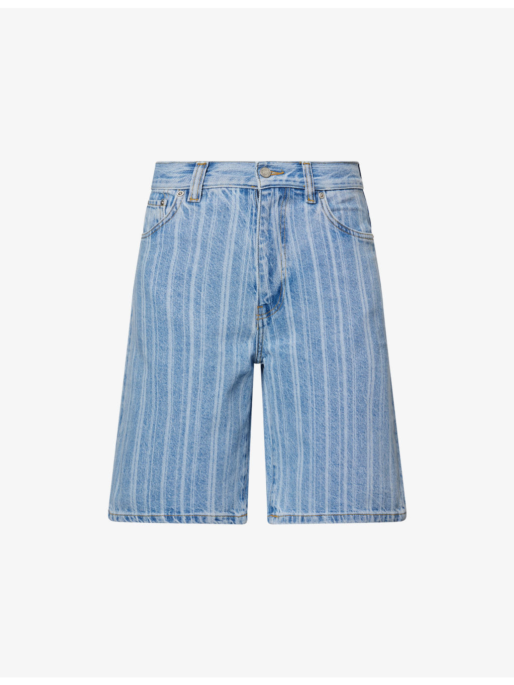 PRODUCT DETAILS - Carhartt WIP denim shorts - 100% cotton; pocketlining 65% polyester, 35% cotton - Button and zip-fly fastening - Loose fit, mid-rise, tapered leg, structured waistband with belt loops, five pockets, branded silver-toned hardware, square logo label woven at back, back yoke, bartack stitching, all-over stripe print - Machine wash at 30°C - True to size - Size 26: rise 11.5in / 29cm, inside leg 9.5in / 24cm, leg opening 22in / 56cm - Model is 5ft 10in/1.78m and wears a size 26 - Midweight, non-stretch Ref: R04469172
