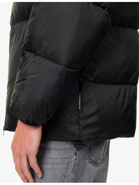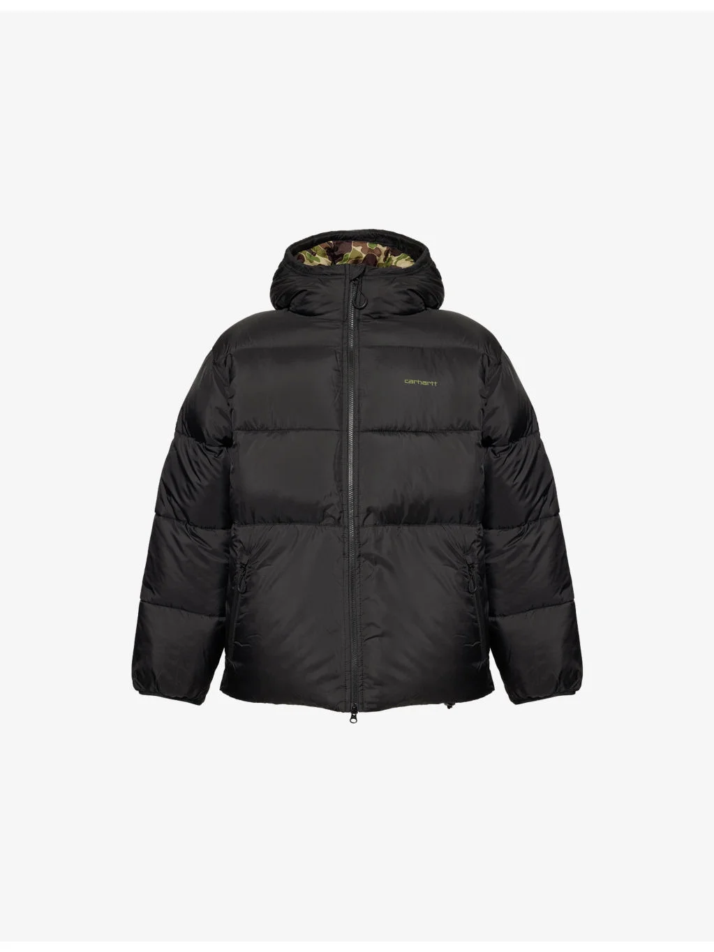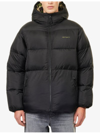 PRODUCT DETAILS - Carhartt WIP shell jacket - 100% polyester; filling 100% polyester; lining 100% polyester - Exposed zip fastening at front - Relaxed fit, high-neck, hood, long sleeves, elasticated cuffs, brand print and two zip pockets at front, all-over quilted and padded, fully lined, drawstring hem - Machine wash at 30°C - Size medium: length 28in / 72cm, chest 48in / 122cm - Model is 6ft 2in/1.88m and wears a size medium - Midweight, non-stretch Ref: R04525426