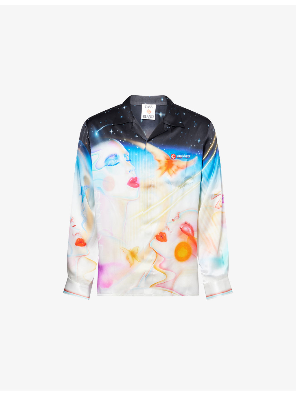 PRODUCT DETAILS - Casablanca silk shirt - 100% silk - Concealed button fastenings at front - Regular fit, cuban collar, long sleeves, buttoned cuffs, patch pocket at chest, logo pattern at chest and back, all-over graphic pattern - Dry clean - Size medium: length 29.5in / 75cm, chest 48in / 122cm - Model is 6ft 2in/1.88m and wears a size medium - Lightweight, non-stretch Ref: R04482281