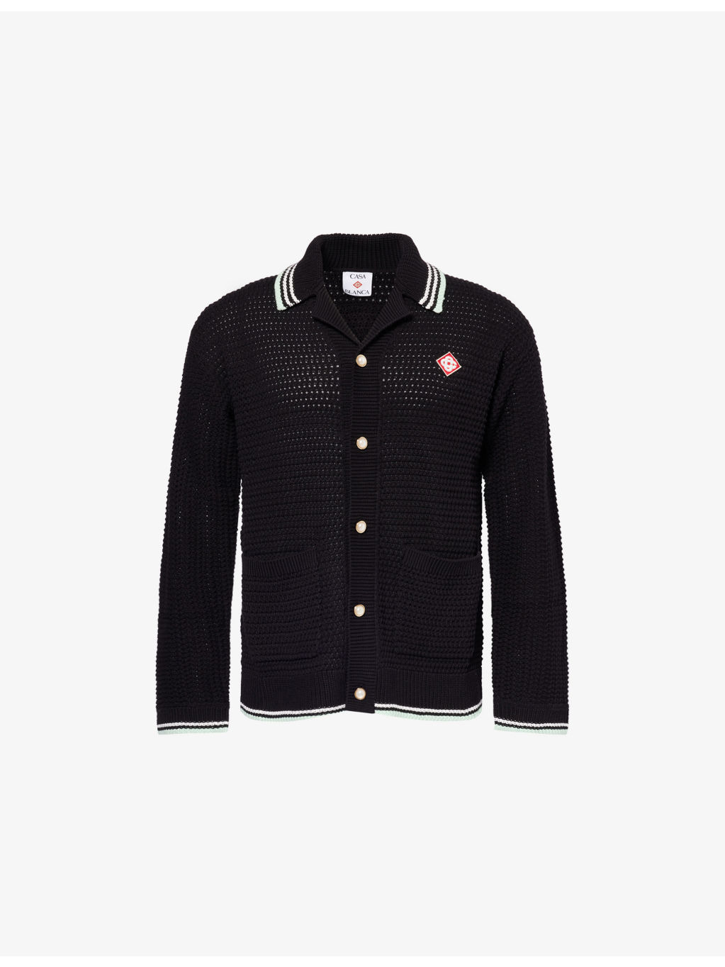 PRODUCT DETAILS - Casablanca cotton-crochet shirt - 100% cotton - Button fastening at front - Regular fit, camp collar, long sleeves, embroidered logo at chest and back, patch pockets at front, striped trims - Hand wash - Model is 6ft 2in/1.88m and wears a size medium - Midweight, slight stretch Ref: R04522911