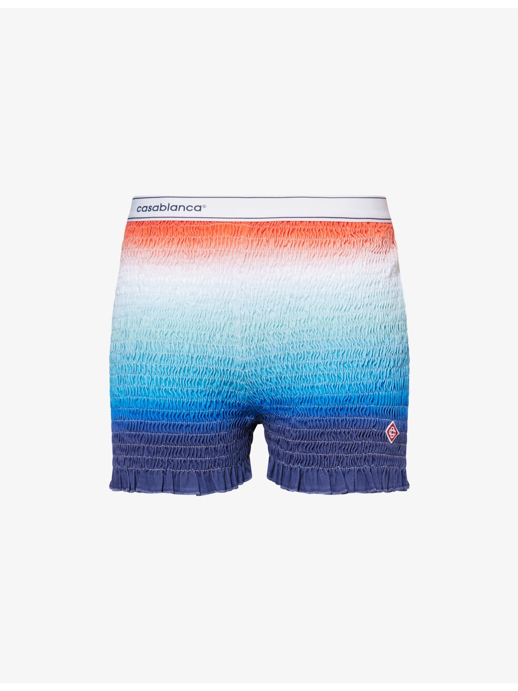 PRODUCT DETAILS - Casablanca cotton-poplin shorts - 100% cotton; contrast 95% polyester, 5% elastane; embellishments 100% viscose - Slim fit, mid-rise, branded elasticated waistband, brand patch at front, all-over gradient colour, shirred, frilled cuffs - Machine wash at 30°C - Made in Portugal - True to size - Model is 5ft 10in/1.78m and wears a size small - Lightweight, stretchy Ref: R04462294