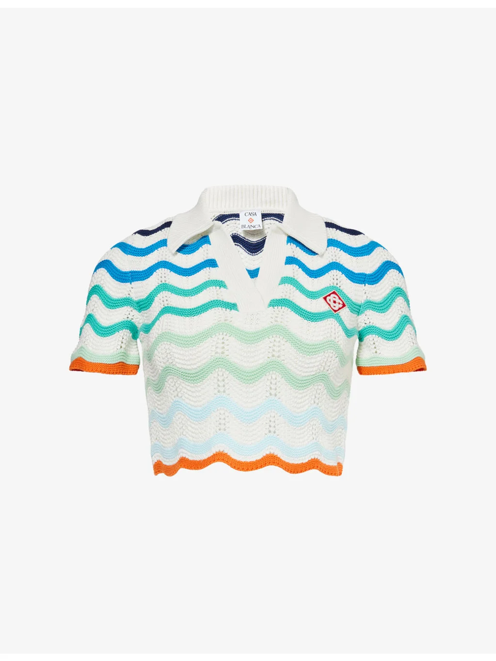 PRODUCT DETAILS - Casablanca cotton-knit top - 100% cotton; embellishments 95% viscose, 5% polyester - Regular fit, cropped, V-neck, spread collar, short sleeves, brand patch at front, all-over gradient wavy striped print, all-over crochet texture, scalloped trims - Hand wash cold - True to size - Model is 5ft 10in/1.78m and wears a size small - Midweight, stretchy Ref: R04462301