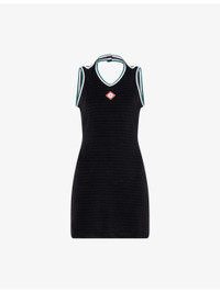 PRODUCT DETAILS - Casablanca stretch-cotton blend mini dress - 73% cotton, 26% polyester, 1% elastane; contrast 86% polyamide, 14% elastane; embellishments 95% viscose, 5% polyester; lining 100% cotton - Pressed stud fastening at back - Slim fit, halterneck, shoulder straps, brand patch at front, plunge neckline at back, all-over ribbed velour texture, fully lined, striped trims - Machine wash at 30°C - Made in Portugal - True to size - Size small: length 31in / 80cm - Model is 5ft 10in/1.78m and wears a size small - Midweight, stretchy Ref: R04463653