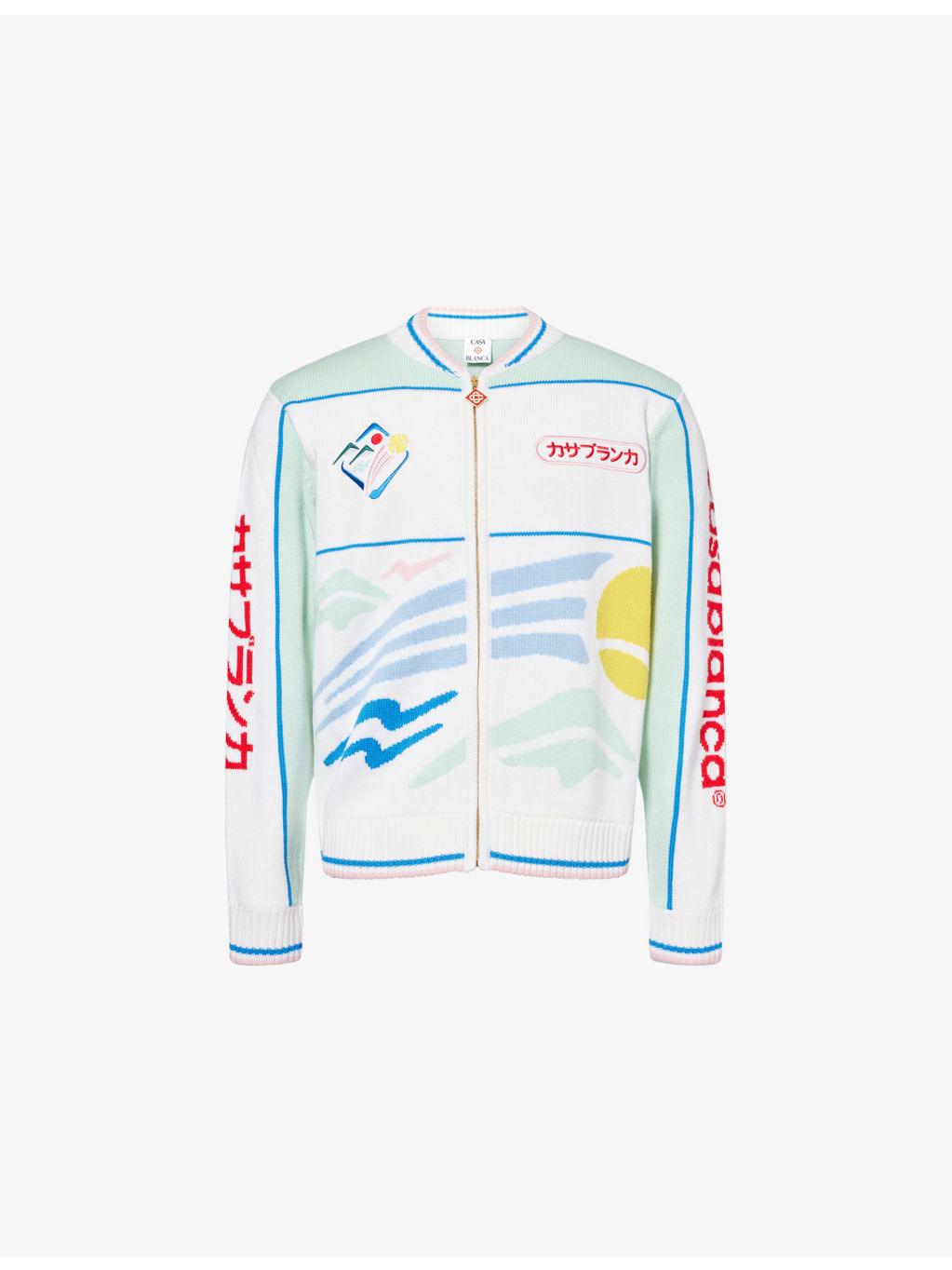 PRODUCT DETAILS - Casablanca wool-knit cardigan - 100% wool - Exposed zip fastening at front - Relaxed fit, V-neck, long sleeves, logo motif at sleeve, logo patch at back, all-over graphic pattern, ribbed trims - Hand wash - Model is 6ft 2in/1.88m and wears a size medium - Midweight, slight stretch Ref: R04482308