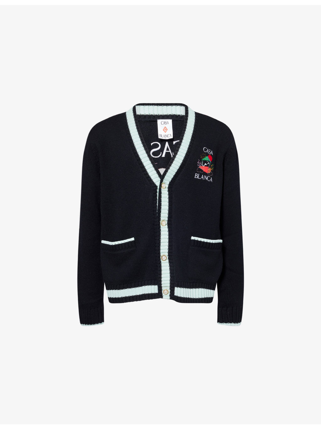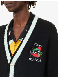 PRODUCT DETAILS - Casablanca wool-knit cardigan - 90% wool, 10% polyamide - Button fastening at front - Relaxed fit, V-neck, long sleeves, embroidered logo at chest, slip pockets at front, embroidered logo at back, striped ribbed trims - Hand wash - Model is 6ft 2in/1.88m and wears a size medium - Midweight, slight stretch Ref: R04482313
