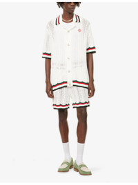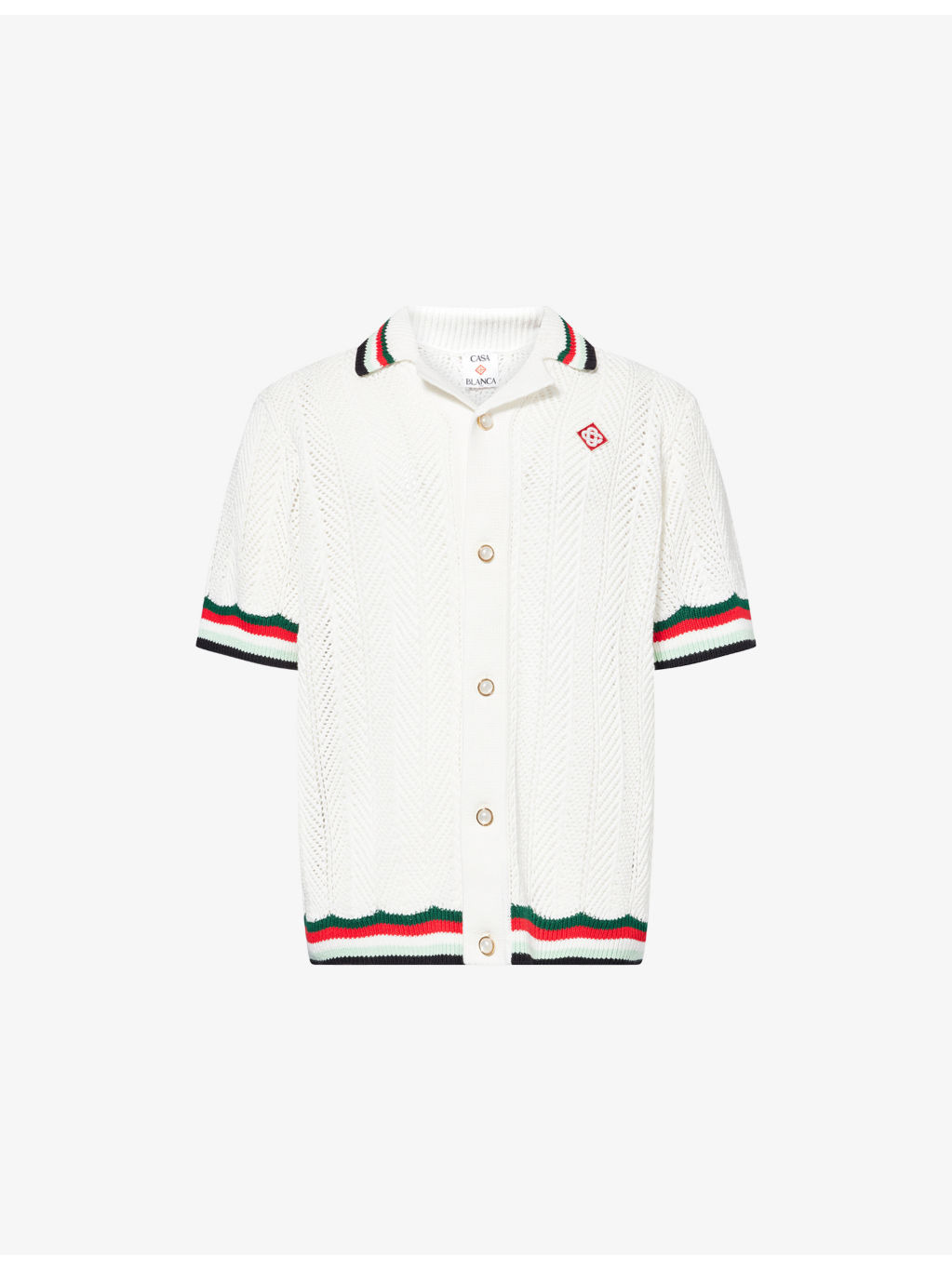 PRODUCT DETAILS - Casablanca cotton-crochet shirt - 100% cotton - Button fastening at front - Regular fit, cuban collar, short sleeves, logo patch at chest, embroidered logo at back, all-over chevron texture, striped trims - Hand wash - Size medium: length 30.5in / 77cm, chest 52in / 132cm - Model is 6ft 2in/1.88m and wears a size medium - Midweight, slight stretch Ref: R04482303