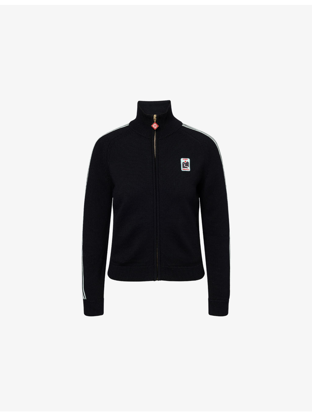 PRODUCT DETAILS - Casablanca wool track jacket - 100% merino wool; embellishments 95% viscose, 5% polyester - Concealed zip fastening at front - Slim fit, high-neck, striped at long sleeves, brand patch at front, all-over knitted, ribbed trims - Hand wash cold - True to size - Model is 5ft 10in/1.78m and wears a size small - Midweight, stretchy Ref: R04463647