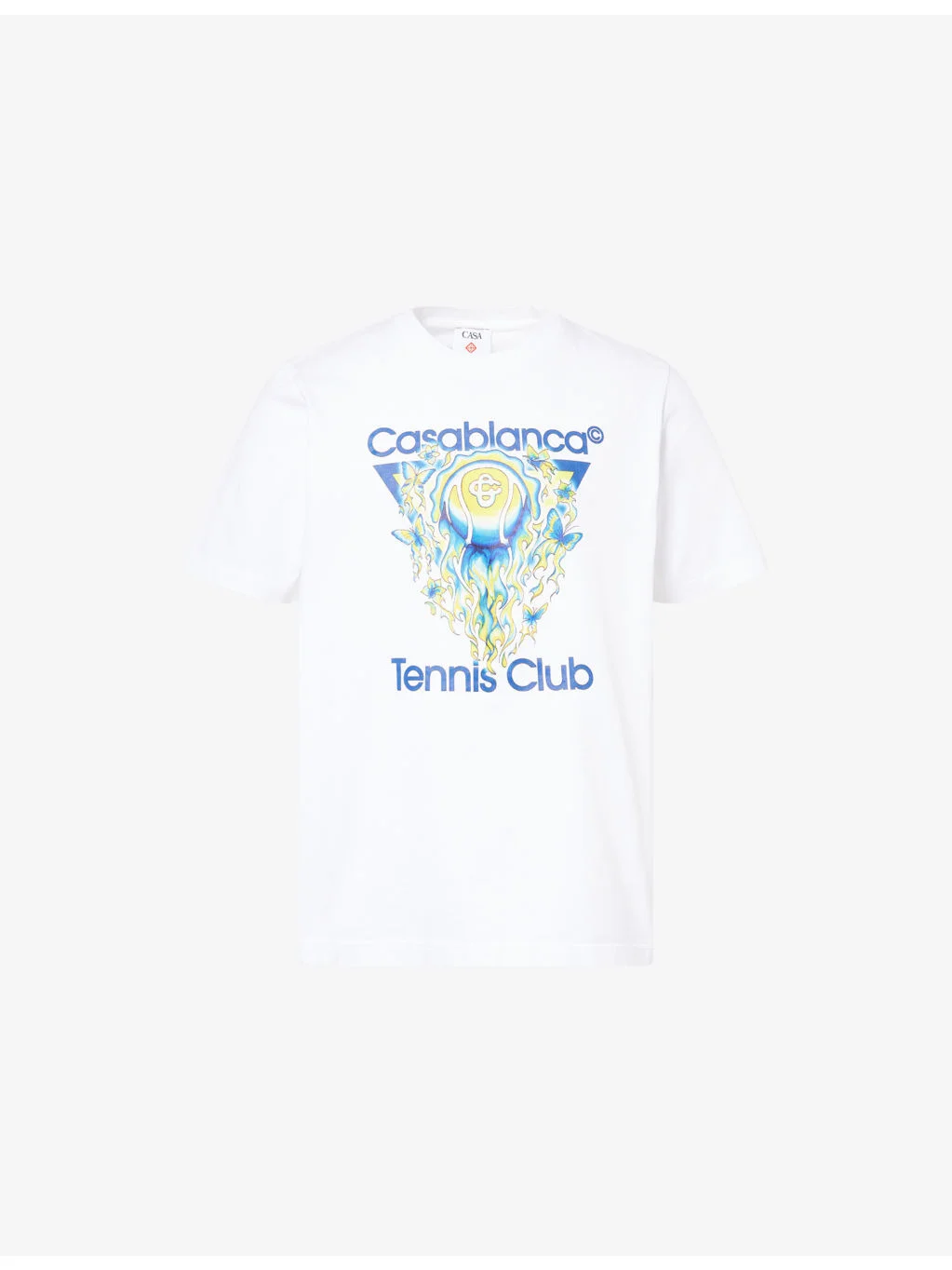PRODUCT DETAILS - Casablanca cotton T-shirt - 100% cotton - Pulls on - Relaxed fit, crewneck, short sleeves, logo print at front, straight hem - Machine wash mild - Model is 6ft 2in/1.88m and wears a size medium - Lightweight, slight stretch Ref: R04548476