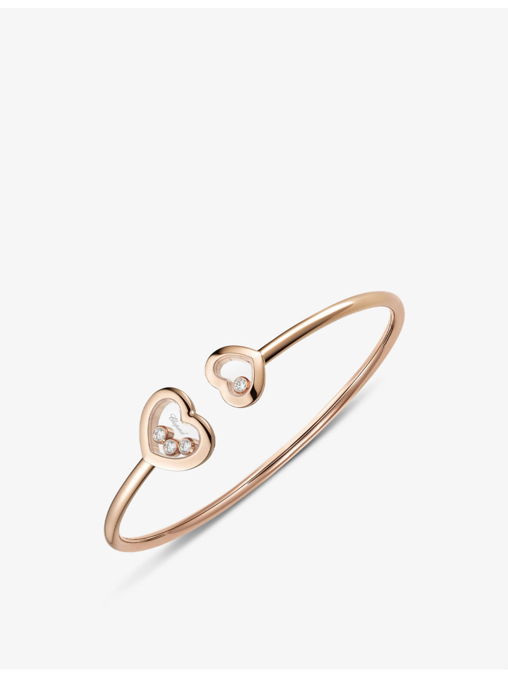 PRODUCT DETAILS - Chopard 18ct rose gold and 0.2ct round-cut diamond bangle - 100% 18ct rose gold - 4 diamonds - Slips on - Open design, two heart-shaped ends, four floating diamonds - Carat weight: 0.2ct - Carat cut: round brilliant - Carat clarity: IF - Please use a soft, dry polishing cloth - Made in Germany - Two-year manufacturer's warranty Ref: R03769972