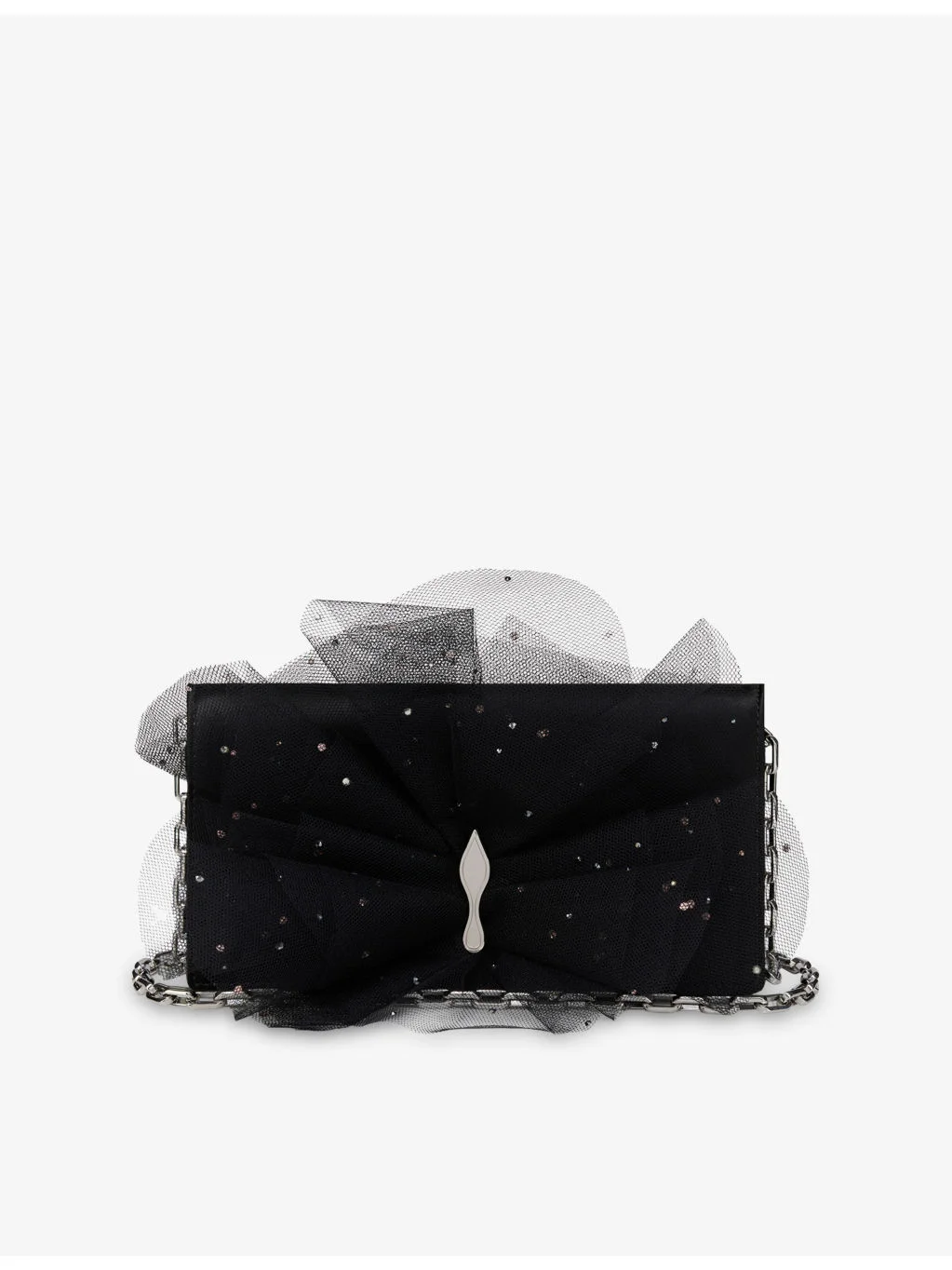 PRODUCT DETAILS - Christian Louboutin leather and tulle clutch bag - 63% polyamide, 37% silk; contrast 100% leather - Flap-over with magnetic button - Structured shape, chain shoulder strap, tulle design at front, one main compartment - Height 12cm, width 22cm, depth 5cm - Specialist leather clean Ref: R04556389