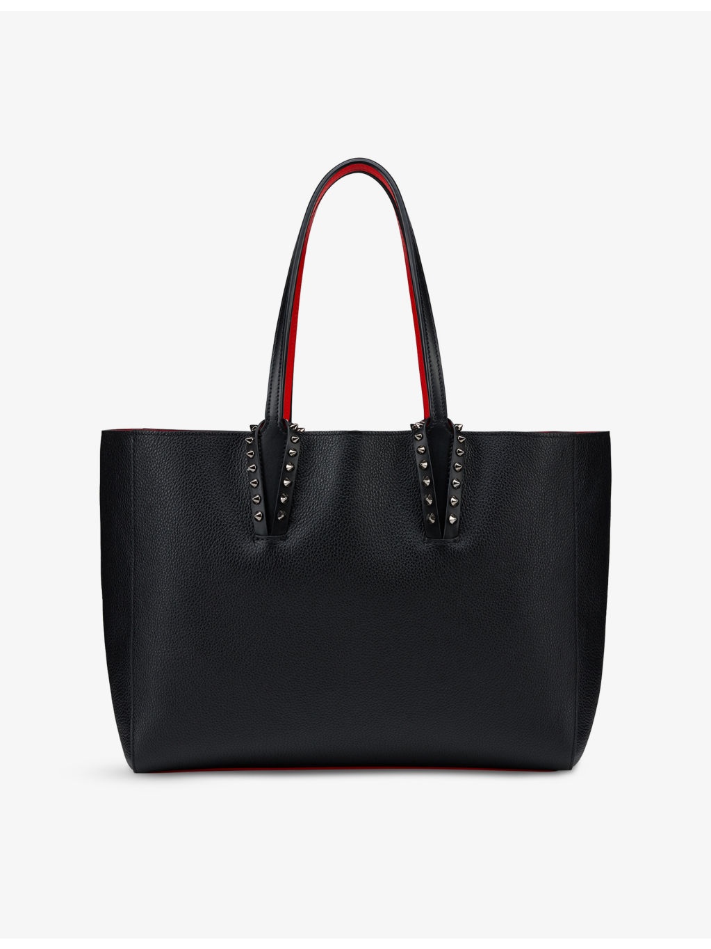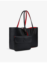 PRODUCT DETAILS - Christian Louboutin leather tote bag - 100% leather - Open top - Two top handles, metal stud-embellished straps surrounding the handles, security hook, signature red lining, one main interior compartment, detachable zipped pouch with wrist strap, logo-embossed red rubber base - Height 24cm, width 34cm, depth 14cm - Specialist leather clean - Made in Italy Ref: R04500335