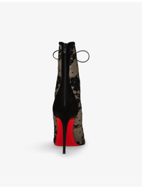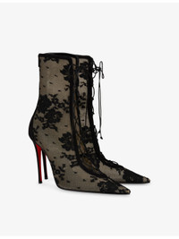 PRODUCT DETAILS - 71% Polyamide, 27% Kid leather, 2% Goat leather - Heel height 100mm - Made in Italy - True to size - Product care – The red lacquer of the soles wears out with use. This is not a manufacturing defect; it is simply normal wear and tear. Christian Louboutin strongly recommends that its customers consult a professional in leather care or a shoemaker for specific care advice. To keep your shoes in good condition, the following leather care is recommended: - Keep the leather area clean and dry using a dry, soft cloth - Always store your products away from light and heat - Protect your leather goods from rain and moisture - Store your products in the Christian Louboutin dust bag provided - Avoid contact with abrasive surfaces - Regrettably we are unable to accept in-store returns on Christian Louboutin orders. - PLEASE NOTE: Due to the delicate nature of the red soles we ask that the shoes be tried on carpeted flooring. If not, they may not be suitable for return. Ref: R04509564