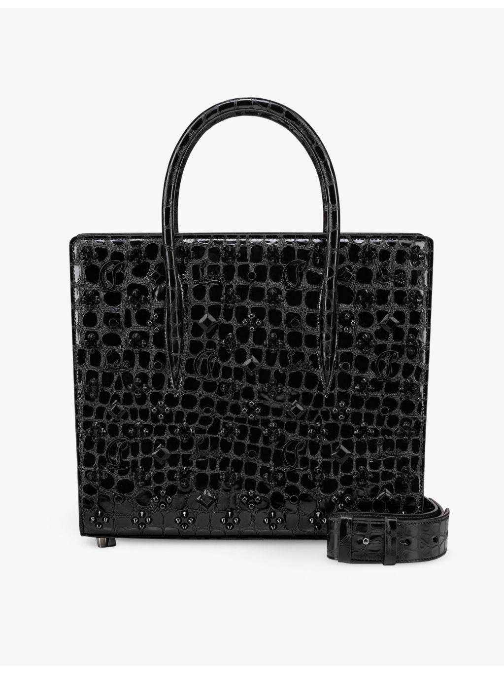 PRODUCT DETAILS - Christian Louboutin medium leather tote bag - 100% calf leather - Zip fastening - Rectangular silhouette, detachable strap, twin top handles, all-over croc-effect, all-over tonal embellishment, one main compartment, one zipped compartment, metal feet - Height 32cm, width 26.5cm, depth 14cm - Specialist leather clean - Made in Italy Ref: R04350013