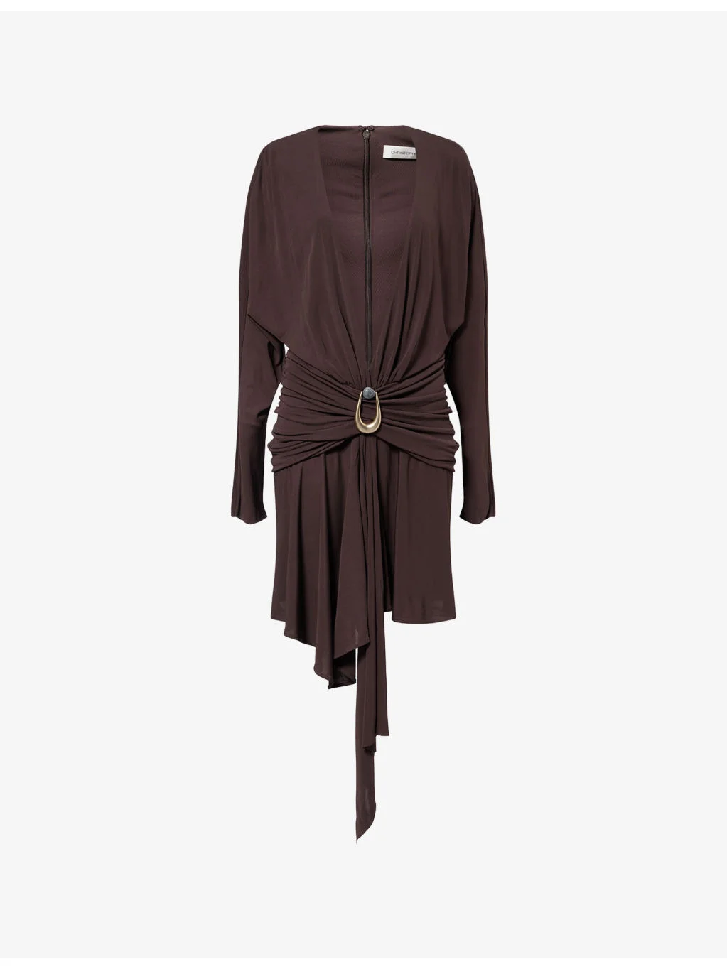 PRODUCT DETAILS - Christopher Esber draped-jersey mini dress - 100% viscose; embellishments 100% zinc alloy - Concealed zip fastening at back - Reguar fit, deep v-neck, long sleeves, gathered draping at waist, embellished pin at front, unlined - Dry clean - True to size - Size UK 8: length 35in / 88.8cm - Model is 5ft 10in/1.78m and wears a size UK 8 - Midweight, slight stretch Ref: R04563483